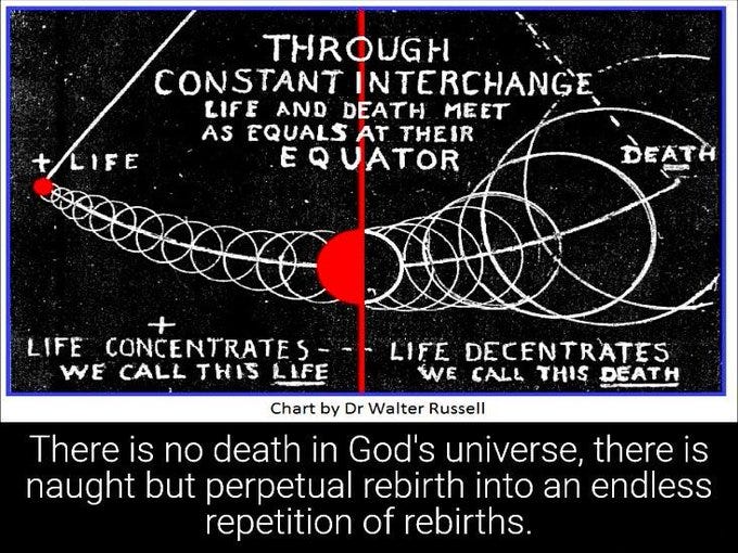 To Russell, this was the cosmic law behind all creation (and one which I will go into much more detail in future articles.) Energy wasn’t in matter - matter merely expressed energy - in perfect symmetry, between polar opposites: light and dark, hot and cold, male and female, positive and negative, life and death, compression and expansion, love and hate and all other opposite terms. The universe wasn’t a soulless machine. It was the expression of the principle of life itself, pulsing in balanced rhythmic cycles.